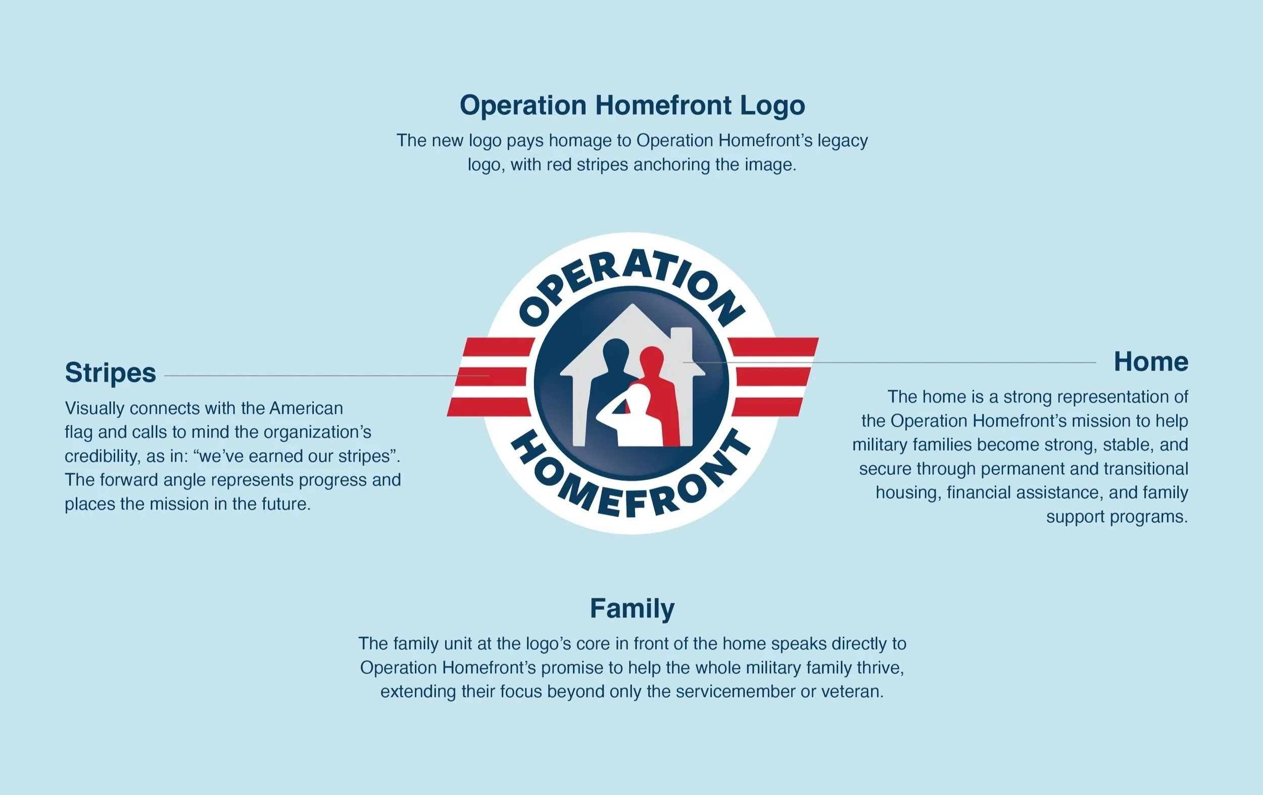 Operation Homefront, a national non-profit providing $40M in annual programming, hired a branding firm after a lengthy RFP process to facilitate a comprehensive rebrand. When the vendor couldn’t deliver quality results, I stepped up to rescue the logo redesign and visual identity development for the organizational rebrand.